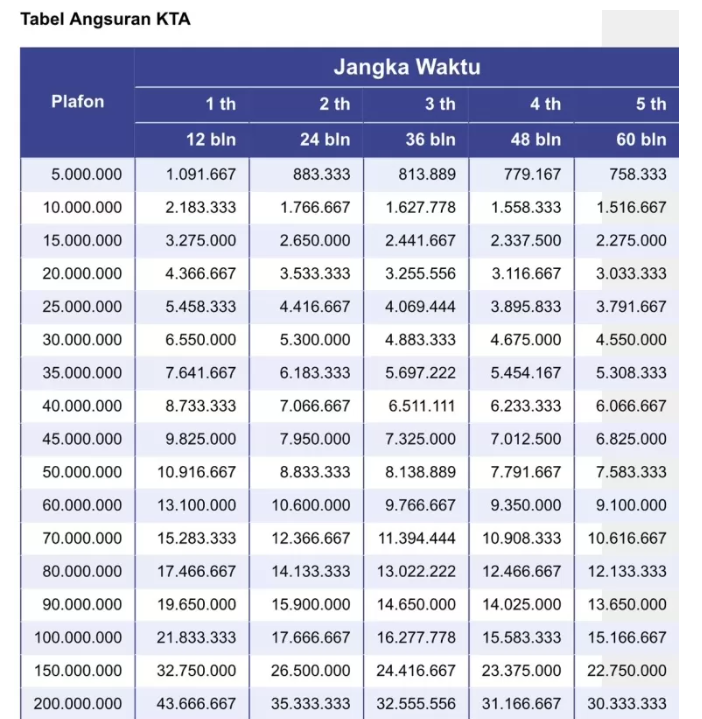 Begitu pula jika misalnya, calon debitur memilih pengajuan plafon terendah yaitu Rp5 juta. Maka, nominal cicilan per bulan berdasarkan tenor yang dipilih adalah: