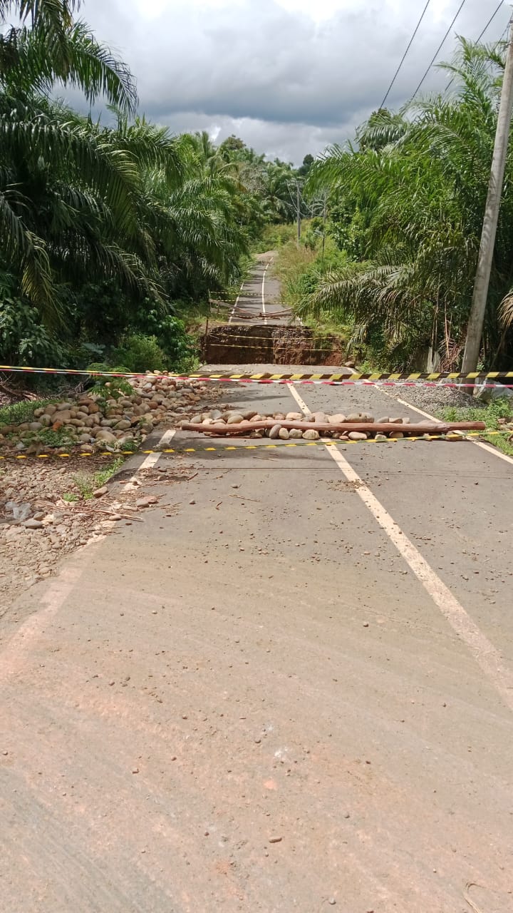 Jalan ini amblas akibat terjadinya longsoran tanah seminggu lalu, hingga gorong-gorong dibawah jembatannya pun jebol.