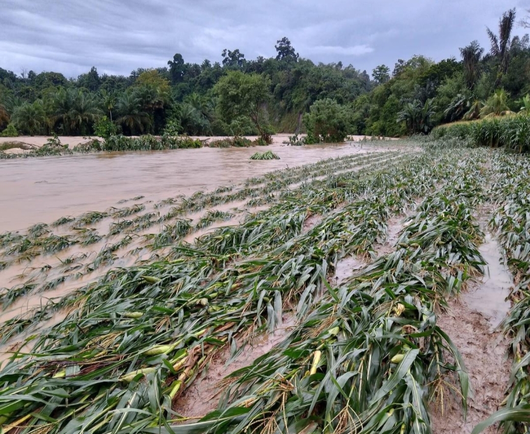 Karena selain mengakibatkan banjir dan tanah longsor di dua lokasi, kebun jagung milik Bumdes dan Masyarakat seluas 1 Hektare juga terancam gagal panen.