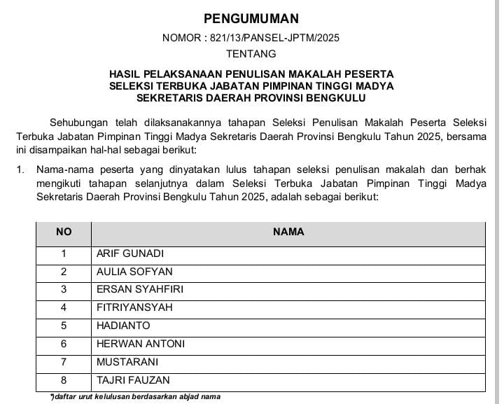 Dalam pengumuman tersebut yang tertuang dalam NOMOR : 821/13/PANSEL-JPTM/2025 tentang hasil pelaksanaan penulisan makalah peserta seleksi terbuka Jabatan Pimpinan Tinggi Madya Sekretaris Daerah Provinsi Bengkulu, ini nama-nama peserta seleksi yang dinyatakan lulus.