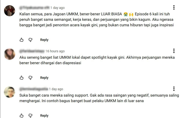 Banyak penonton mengaku terinspirasi oleh semangat dan keteguhan para pengusaha UMKM yang menghadirkan kisah perjuangan nyata penuh emosi dan motivasi, terlihat dari kolom komentar YouTube Shopee Indonesia yang dipenuhi ungkapan dukungan dan apresiasi dari netizen. Setiap tayangan tidak hanya memancing decak kagum, tetapi juga membangkitkan rasa bangga terhadap kreativitas dan daya juang anak bangsa yang berani berinovasi dan terus berusaha untuk naik kelas.
