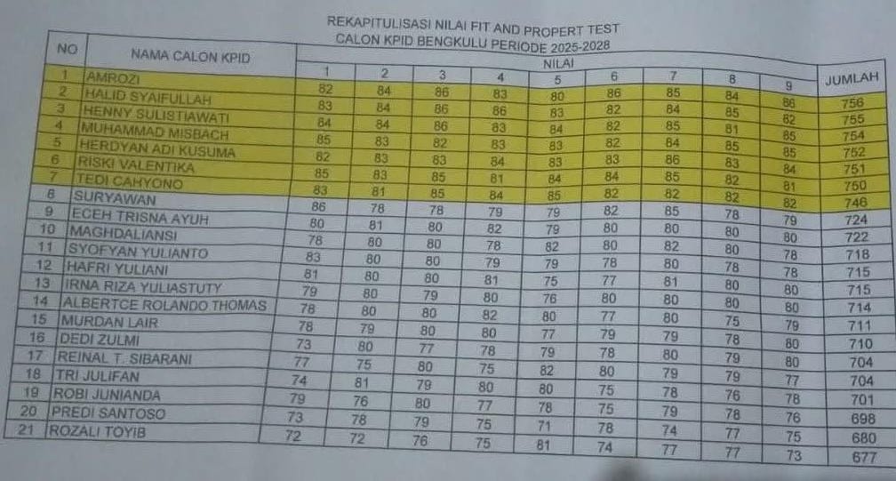 Dari perangkingan yang ditetapkan, tujuh besar calon komisioner KPID Bengkulu yakni: