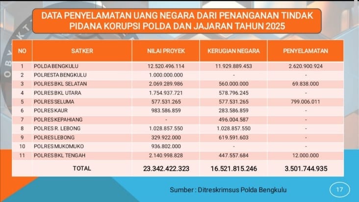 Polda Bengkulu Berhasil Selamatkan Rp3,5 Miliar Uang Negara dari Kasus Korupsi Sepanjang 2025