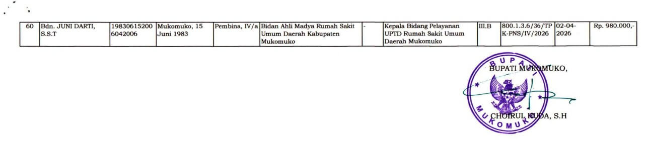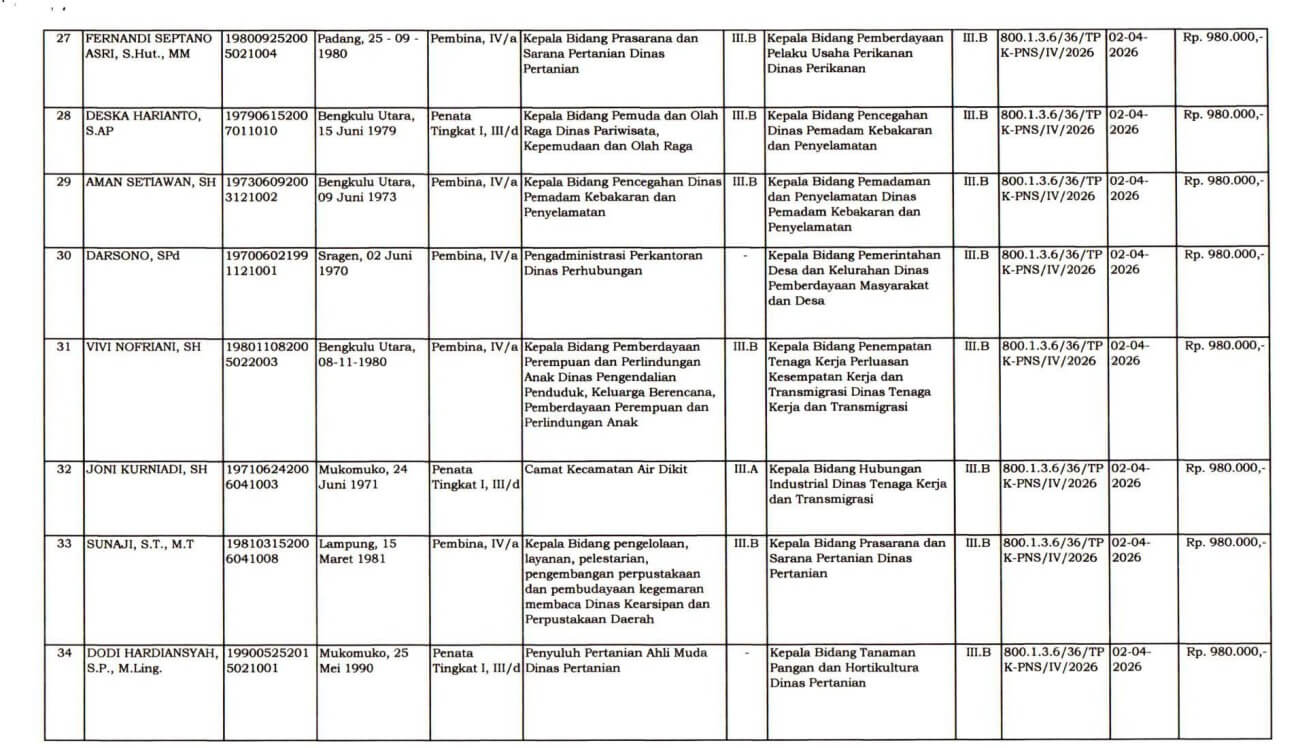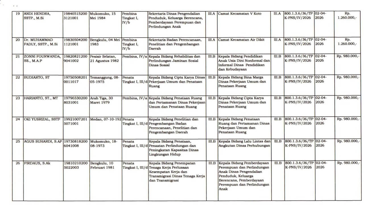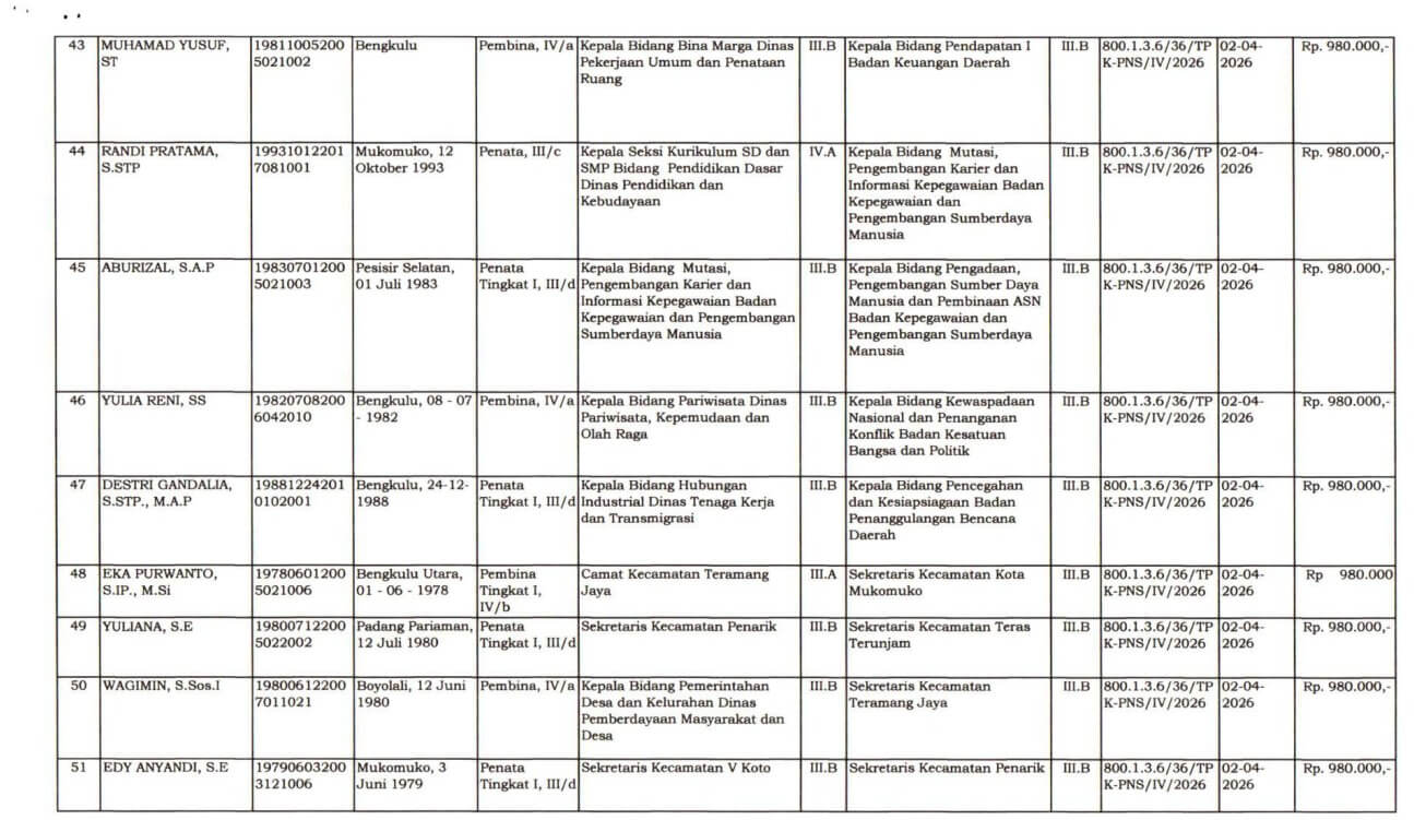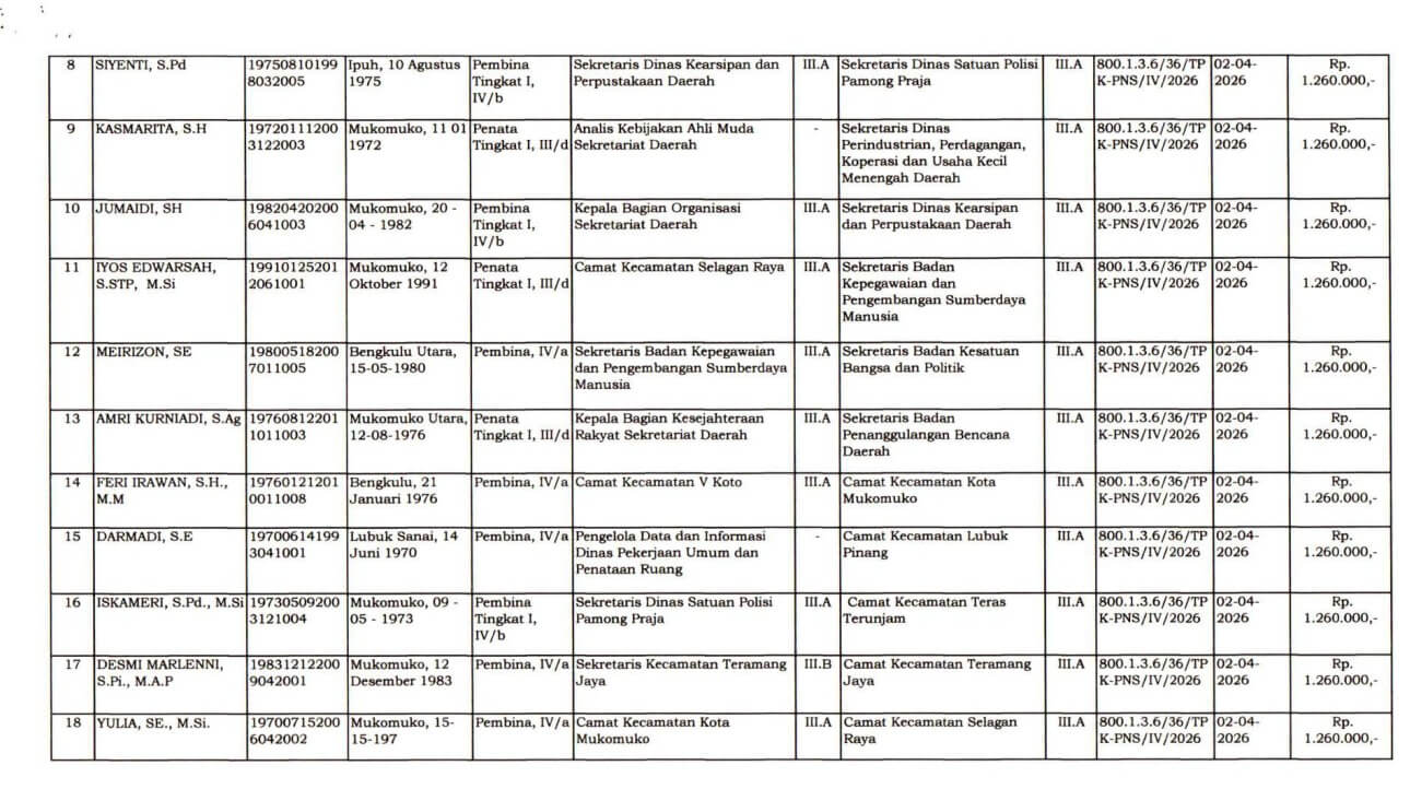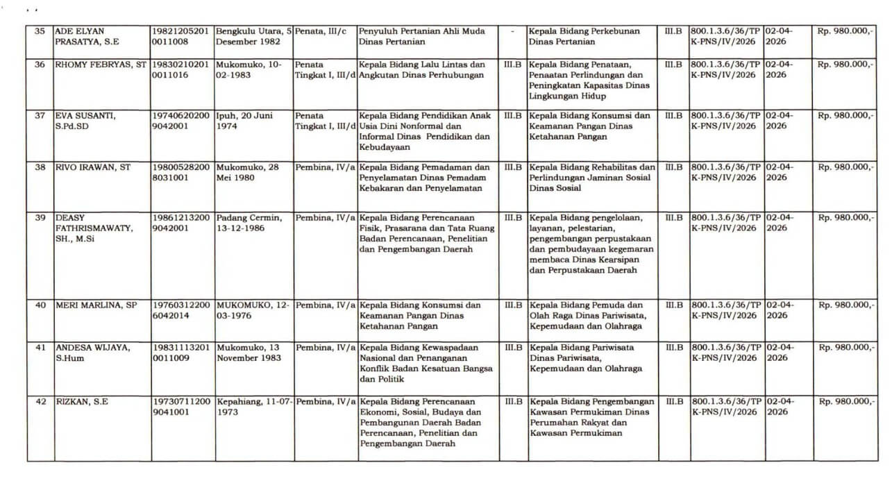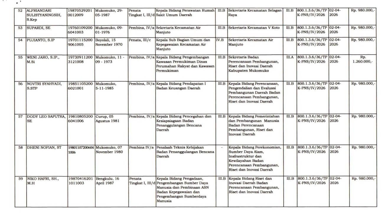 Daftar Nama Lengkap 109 Pejabat Eselon III dan IV yang Dilantik Bupati Mukomuko