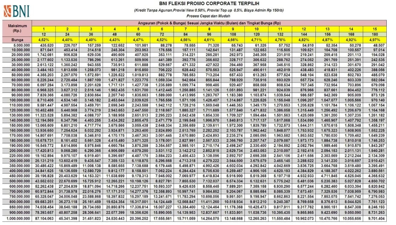 Untuk bunganya per tahun berbeda beda. Demikianlah informasi tentang tabel angsuran pinjaman BNI tanpa jaminan selain KUR, bunga rendah dan tenor panjang. Semoga bermanfaat.