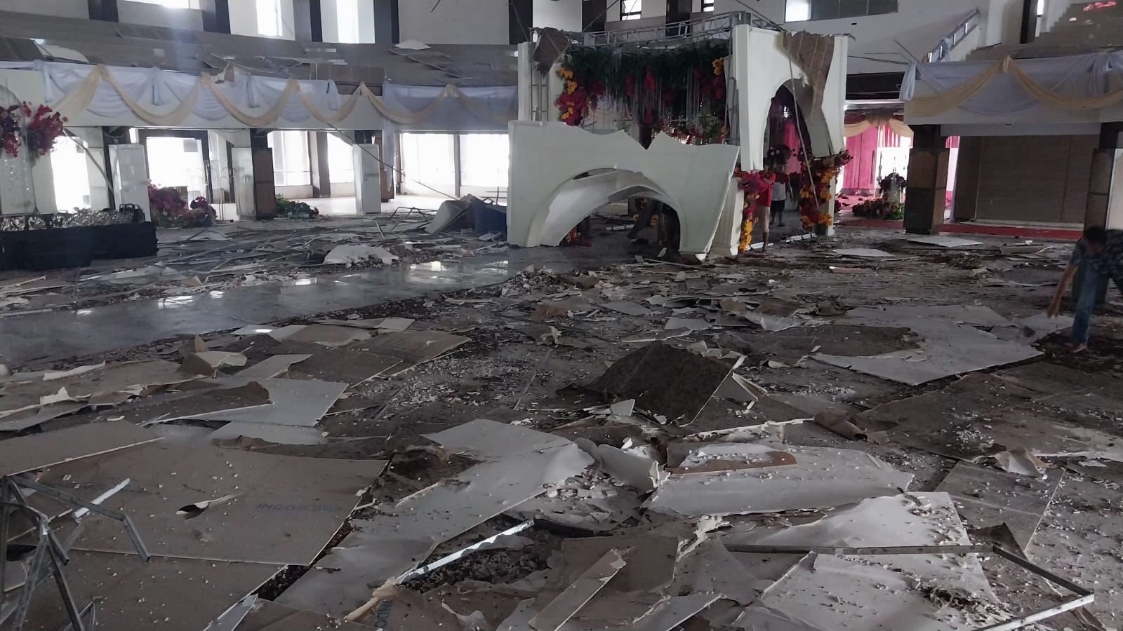 Pada Jumat pagi, tampak beberapa orang dari pihak pelaminan membersihkan puing-puing plafon yang amruk di dalam gedung.