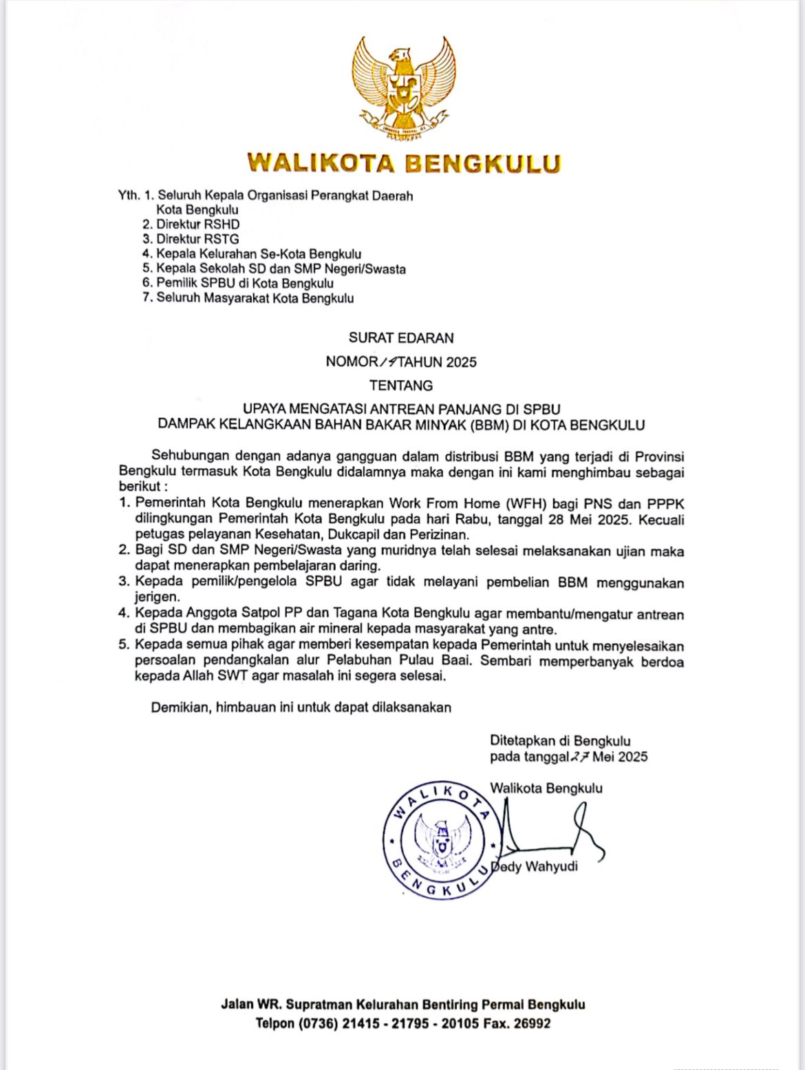 Wali Kota Bengkulu Dedy Wahyudi Keluarkan Surat Edaran Menyikapi Kelangkaan BBM, Rabu 28 Mei 2025 WFH