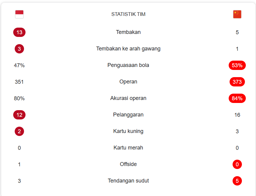 Indonesia vs Cina Unggul 1-0, Indonesia Berada di Posisi 3 Klasemen Grup C