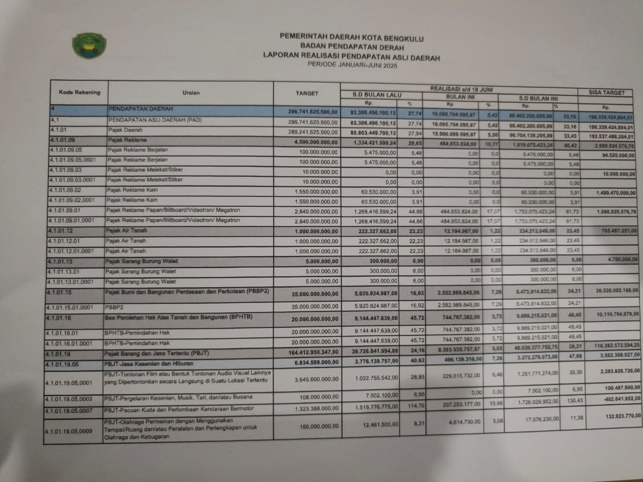 Daftar uraian PAD Kota Bengkulu periode Januari hingga Juni tahun 2025