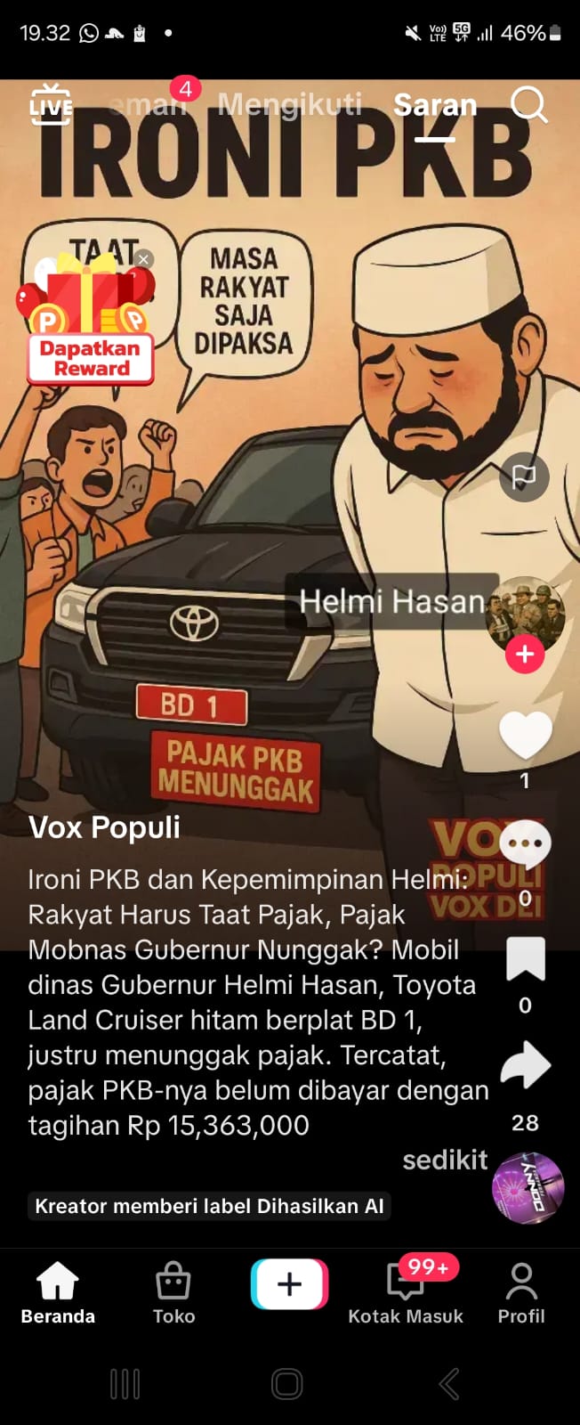 “Itu Fitnah, pajak kendaraan dinas BD 1 itu sudah lunas pajak kendraan. Tidak benar Mobnas BD 1 Gubernur itu nunggak pajak. Pajak sudah lunas dibayar pada 23 Juli 2025. Jadi postingan yang beredar di media sosial TikTok itu tidak benar,” kata Hadianto, Sabtu malam (26/07)