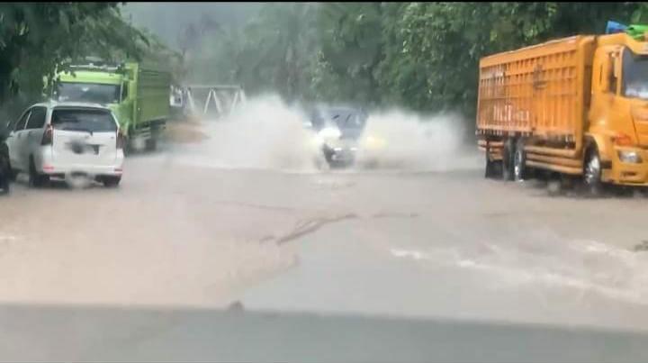 Banjir yang terjadi akibat luapan air sungai yang masuk ke badan jalan dengan ketinggian mencapai 30 cm.