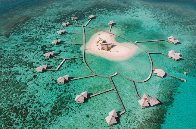 The Maldives isn't the only island resort; Indonesia has one too. It's called Pulo Cinta, located in Tomni Bay, Gorontalo. It's called Pulo Cinta, or the island of love, because the resort is shaped like a heart when viewed from above. This island has a unique appeal with its expanse of clean, clear water.