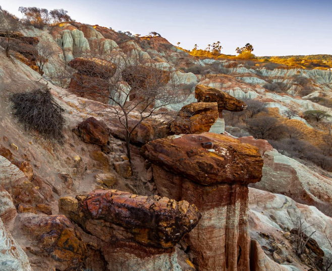 The cliffs at Kelabba Madja feature shades of blue, white, brown, and red. These colors occur naturally, as if painted with a giant paintbrush. In addition to the rainbow cliffs, there is also a miracle in the form of balancing rocks. These three rocks stand firmly at the top of the tapering cliff.