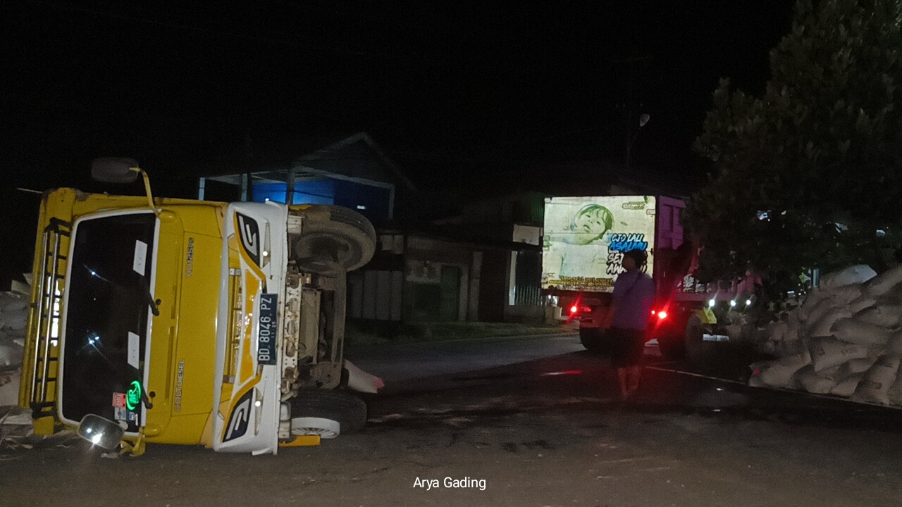 SELUMA, RBTVDISWAY.ID - Kecelakaan tunggal dialami truk bernopol BD-8046-PZ yang bermuatan sekam padi, di depan cucian mobil Deki Simpang Jembatan Fly Over Seluma pada Senin sore menjelang Maghrib (8/12), sekitar pukul 17.40 wib.