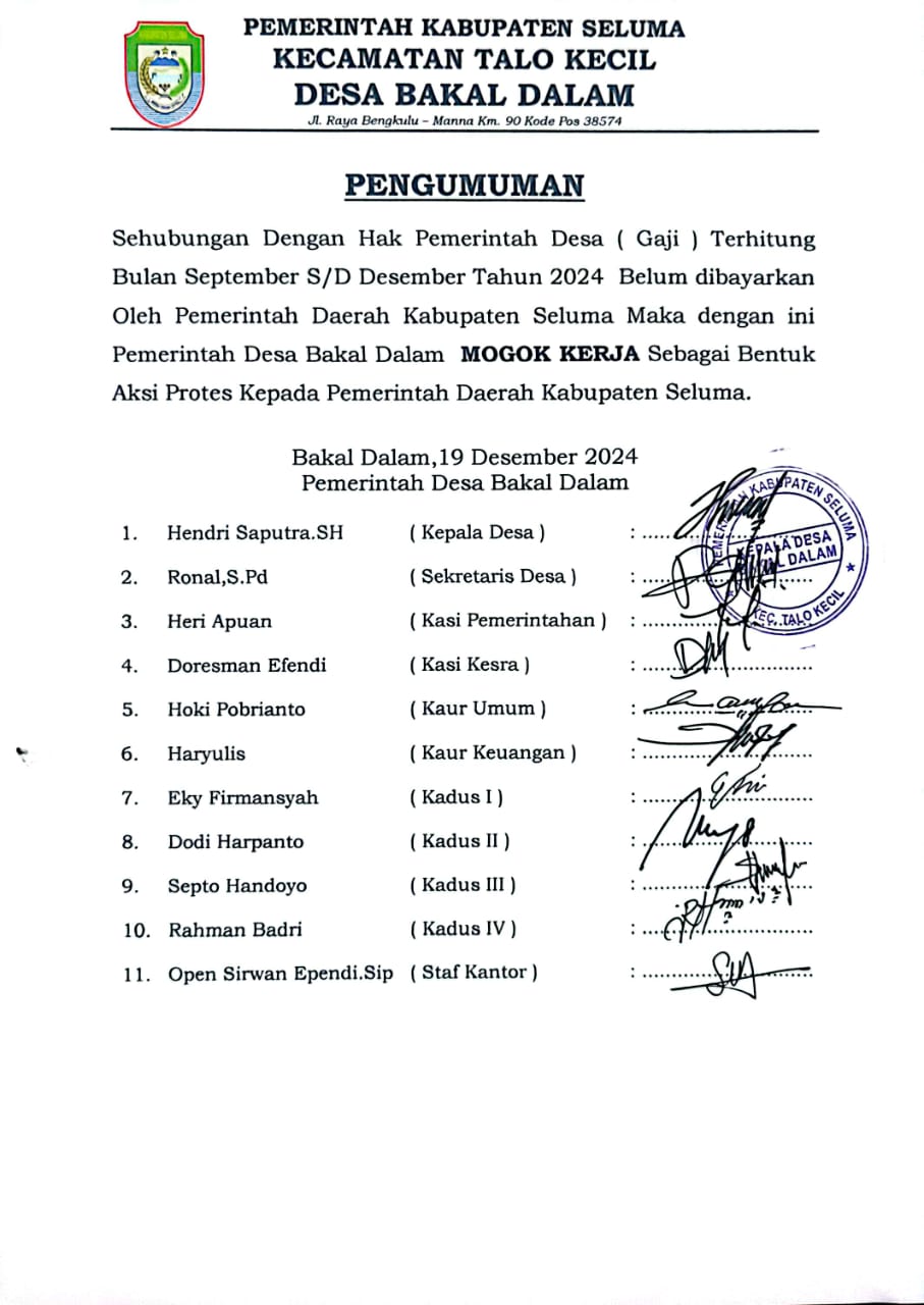 SELUMA, RBTVCAMKOHA.COM - Gara-gara gaji mereka tak kunjung dibayarkan selama 4 bulan, terhitung September hingga Desember 2024 ini, Pemerintah Desa Bakal Dalam Kecamatan Talo Kecil Kabupaten Seluma, melakukan aksi mogok kerja.