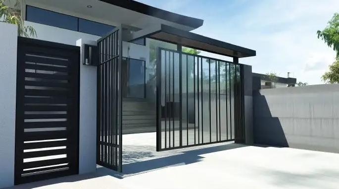 Pagar ini menggabungkan material besi dan kaca tempered untuk tampilan yang lebih ringan dan futuristik. Cocok untuk rumah minimalis modern yang mengutamakan transparansi.