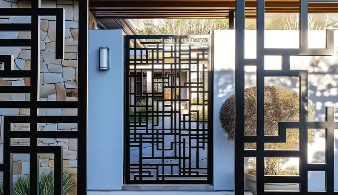 Pola geometris pada pagar menciptakan tampilan berani dan modern. Sangat cocok untuk rumah bergaya futuristik yang ingin tampil beda.