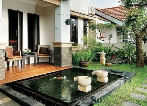 15. Teras Rumah Sederhana dengan Kolam Koi