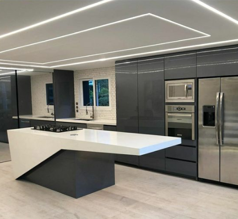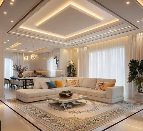 Model plafon ini memanfaatkan bentuk persegi panjang yang sering kali memanjang sepanjang ruangan, memberikan kesan luas dan rapi. Cocok untuk ruang tamu atau ruang makan dengan desain minimalis modern.