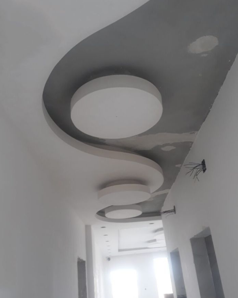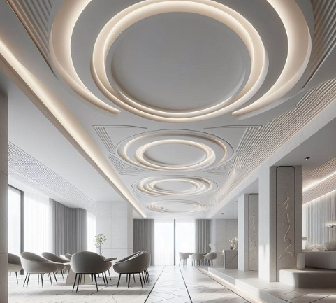 Desain lingkaran pada plafon gypsum memberikan kesan artistik yang lebih lembut dan mengalir. Model ini sering digunakan untuk area ruang tamu atau foyer.