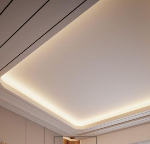 Trim kayu halus yang membingkai tepi plafon memberikan nuansa alami dan elegan tanpa meninggalkan konsep minimalis. Cocok untuk ruangan dengan aksen kayu pada furnitur.