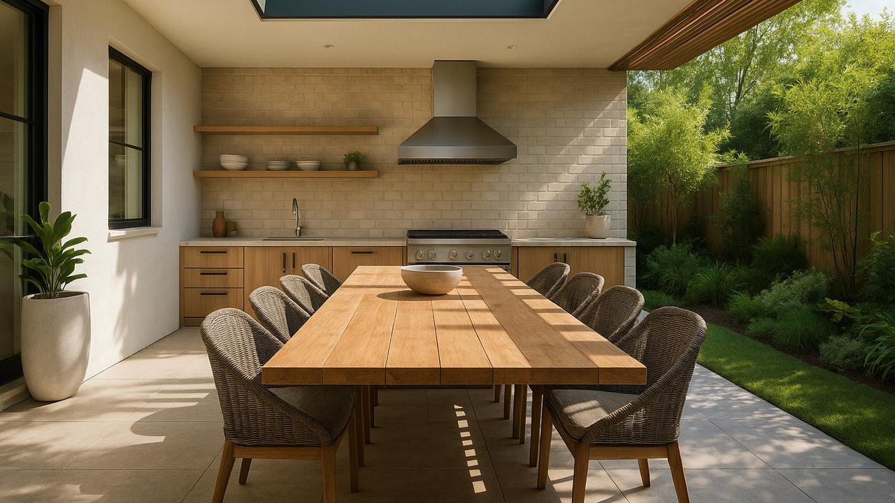 Model dapur ini mengintegrasikan kitchen island yang besar atau meja makan panjang di area outdoor, menciptakan ruang yang nyaman untuk bersantap dan bersosialisasi.