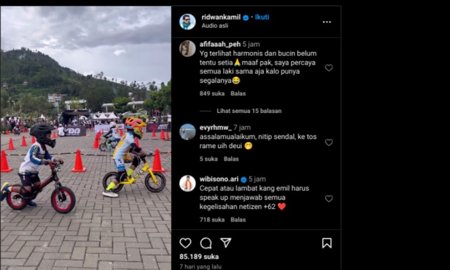 Dalam unggahan itu, RK menulis, “Kemarin Minggu mengantar anak untuk ikut perlombaan push bike untuk para balita. Semoga apa pun hasilnya, meningkatkan rasa percaya diri anak-anak tersebut.”