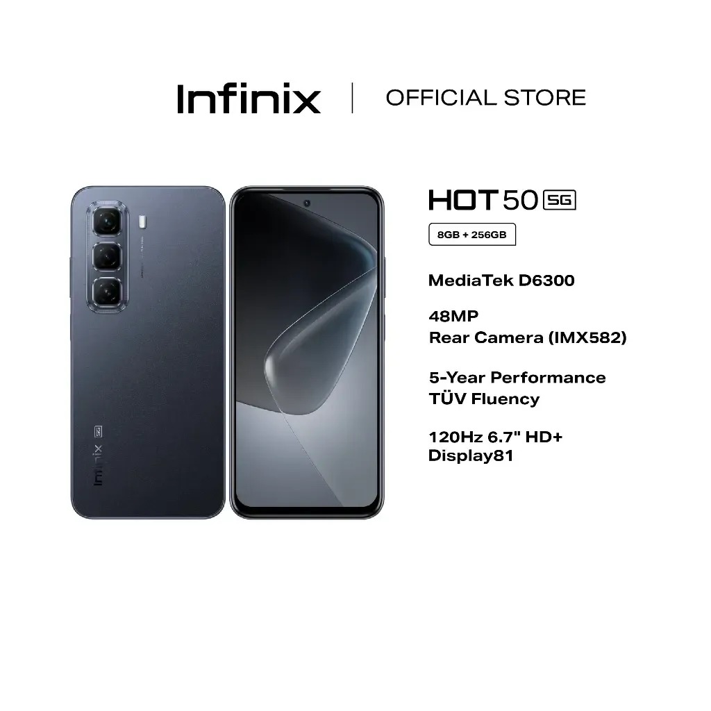 HP 5G murah yang kedua adalah Infinix Hot 50 5G. Katanya, HP ini sudah ditenagai Chipset MediaTek Dimensity 6300 (6nm), RAM 8/256GB, skor AnTuTu 432.000+. Fitur: side fingerprint, jack audio, IP54.